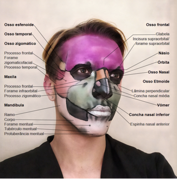 Foto de pintura corporal representando os ossos do crânio e principais acidentes ósseos, adaptada da prancha 4 “Crânio: vista anterior - norma frontal” do Atlas de Anatomia Humana (NETTER, 2014).