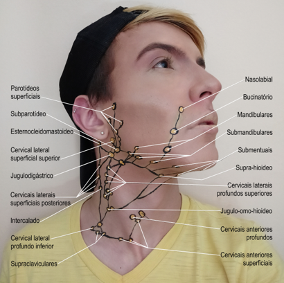 Foto de pintura corporal representando os linfonodos e vasos linfáticos da cabeça e pescoço, adaptada da prancha Prancha 74 “Vasos Linfáticos e Linfonodos da Cabeça e do Pescoço” do Atlas de Anatomia Humana (NETTER, 2014).