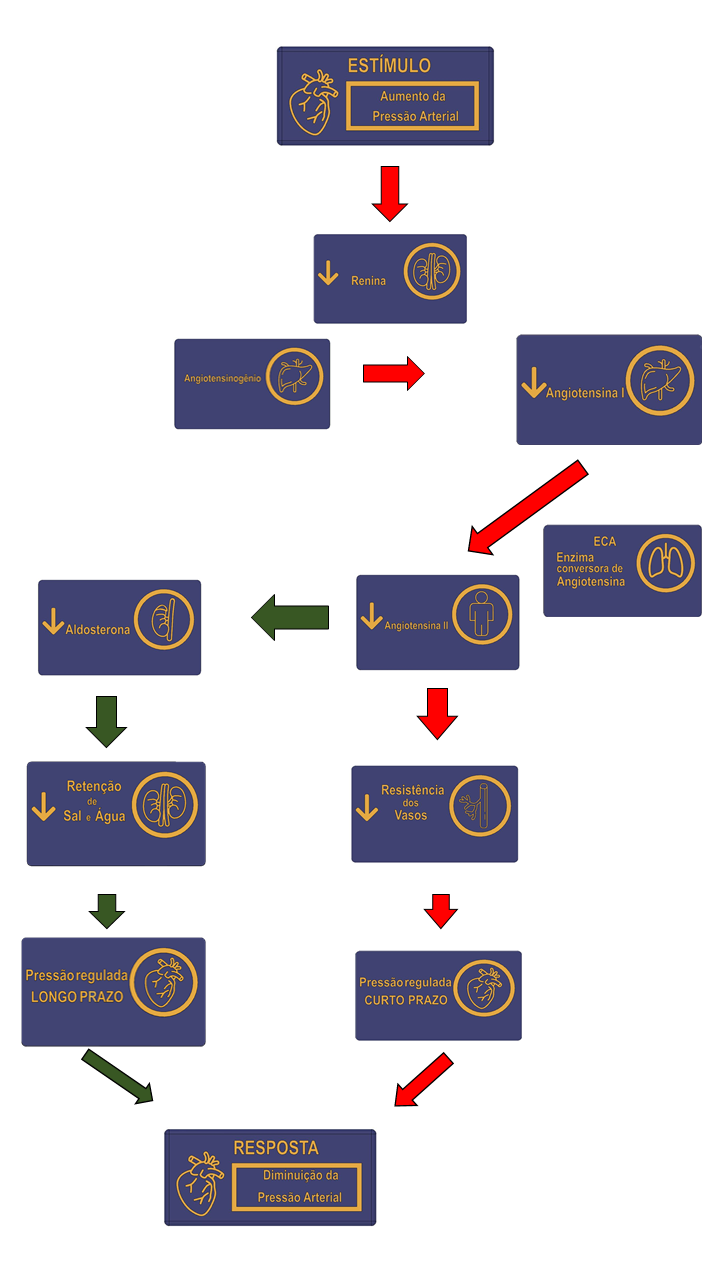 Peças de fluxograma metabólico referente ao controle da pressão arterial em caso de excesso de sal no corpo humano.