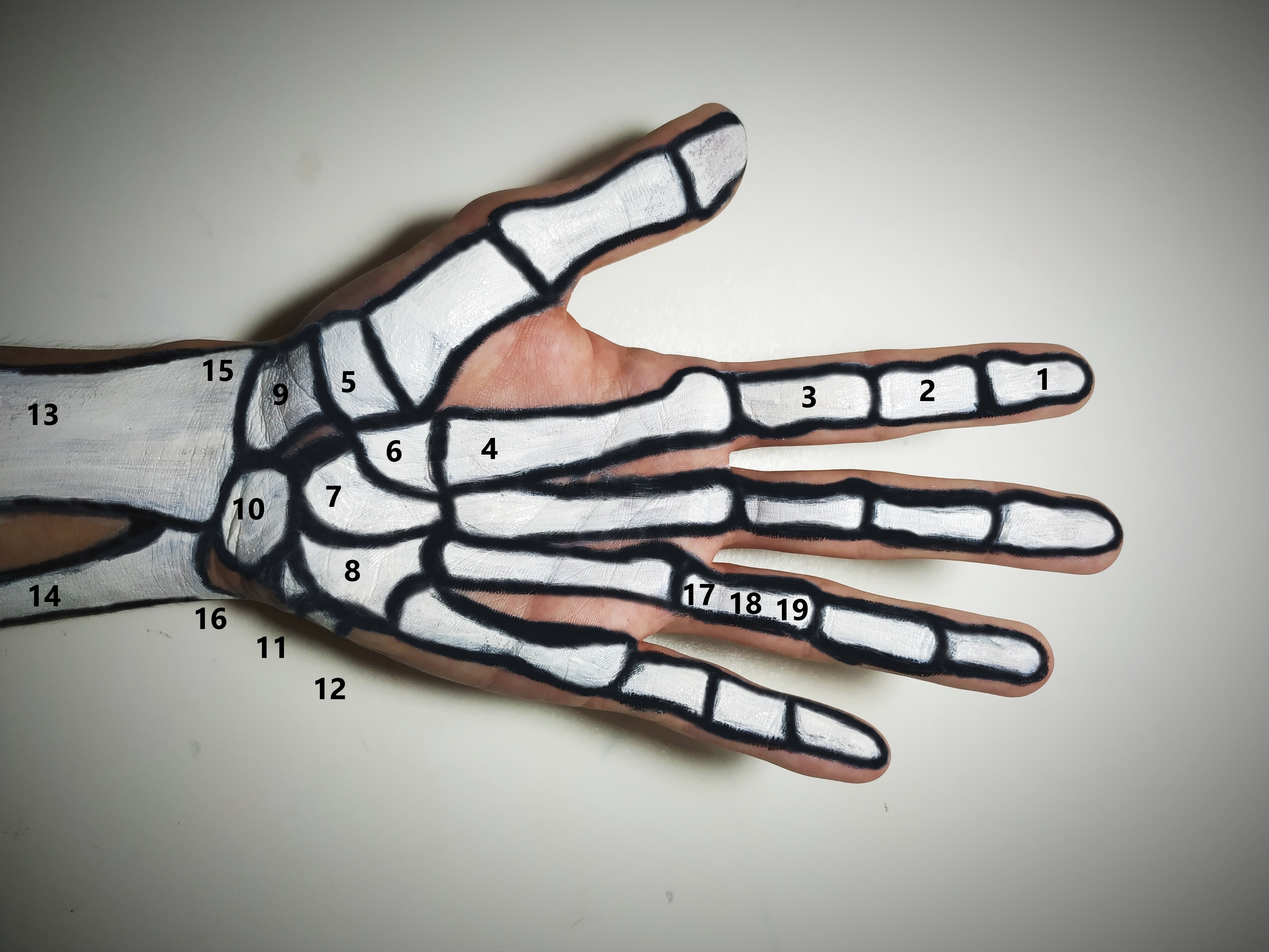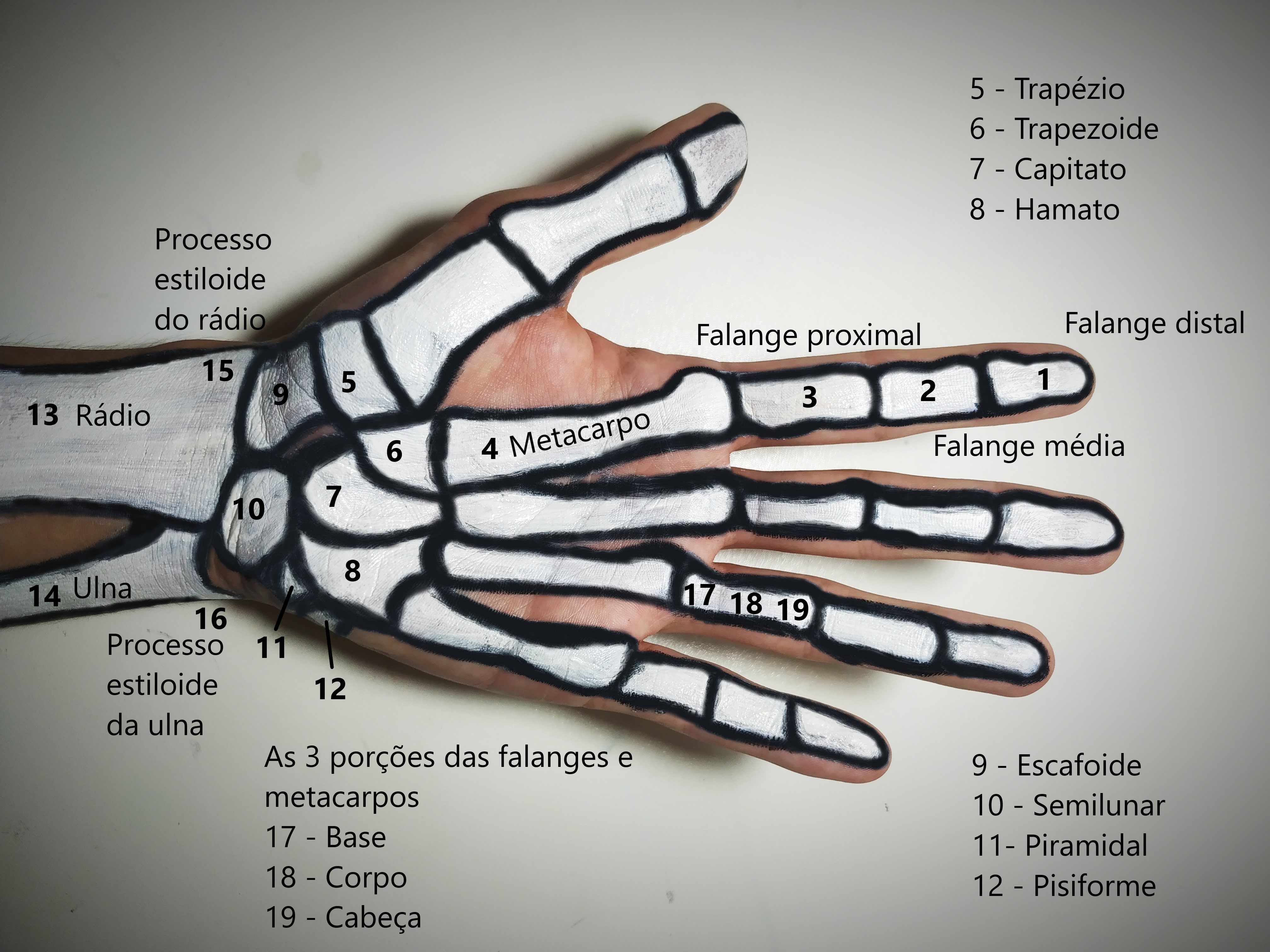 Foto de pintura corporal representando os principais ossos do punho e da mão.